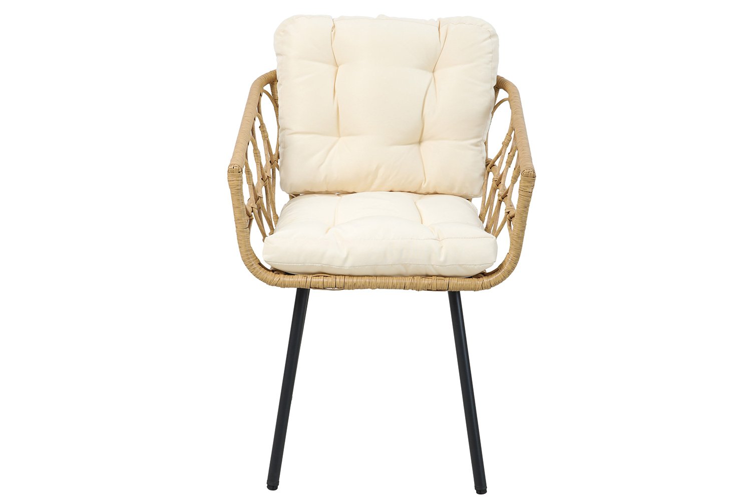 Внешний вид мебели: подлокотники с широким переплетением искусственного ротанга бежевого цвета у кресел предают им нежный вид. Такое же, но плотное переплетение образует столешницу столика, сверху него лежит закаленное стекло, которое обеспечивает дополнительную прочность. Ножки и столика, и стульев – черные, материал – сталь.